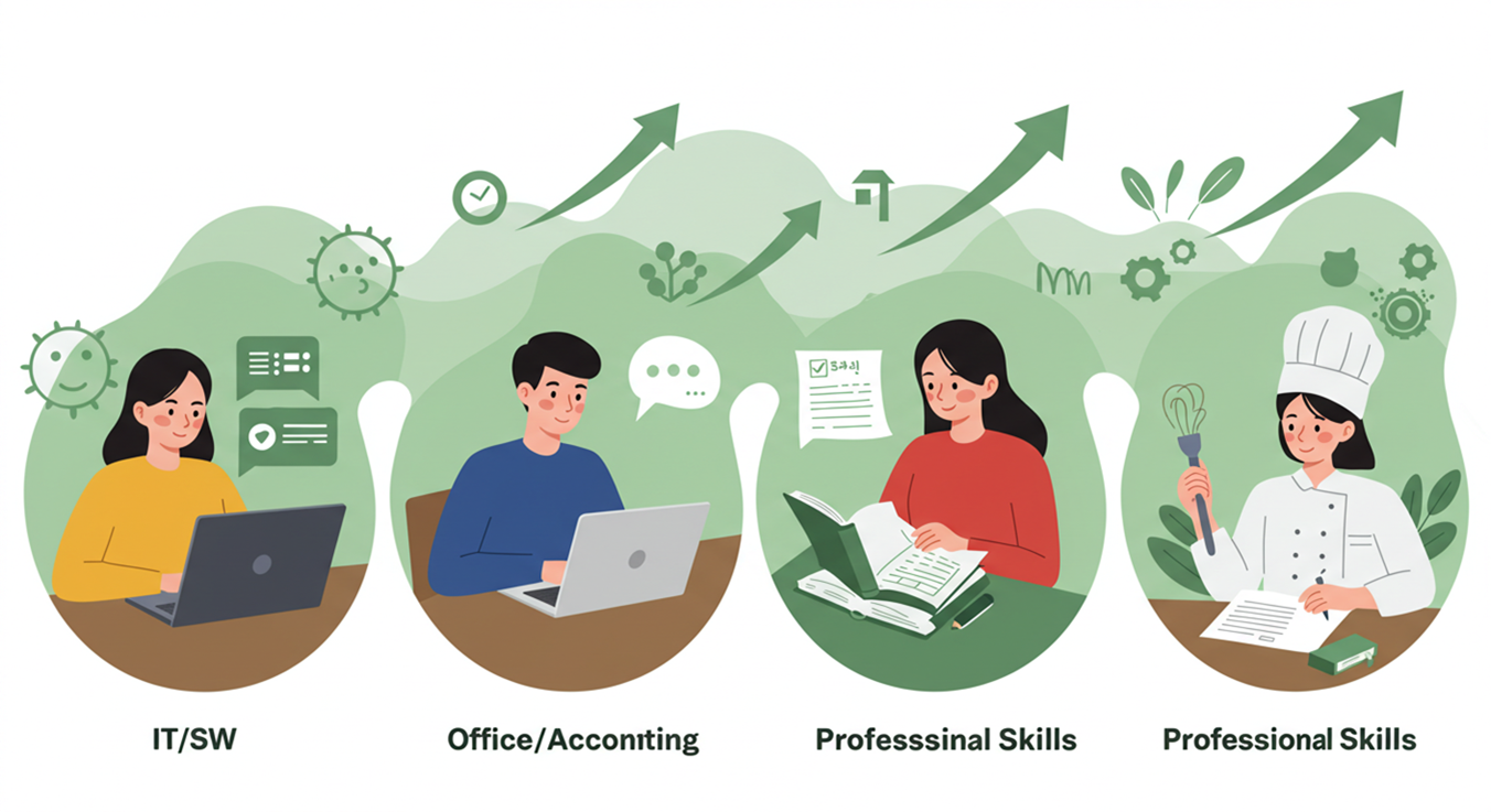 사무/회계/마케팅 분야는 자격증 취득이 중요한 경우가 많아요. 훈련 과정에 자격증 대비반이 포함되어 있는지, 혹은 수료 후 별도로 자격증을 취득할 수 있도록 지원하는지 확인하는 것이 좋아요.