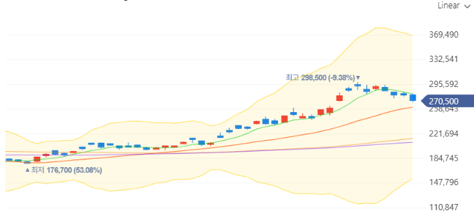 - ❌ 고점 부담과 단기 저항: 290,000원 부근에서 저항을 맞고 잠시 주춤하는 모습을 보였습니다. 이 가격대를 강하게 돌파하지 못한다면 추가적인 기간 조정이 발생할 수 있습니다.